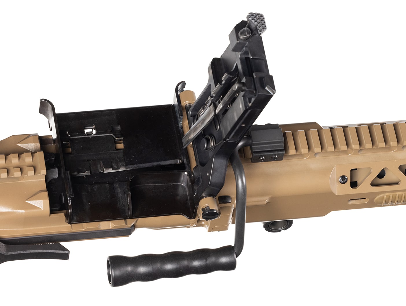 - Patented sliding feed cover and tray that enablesthe use of higher magnification optics that can extend beyond the 10-inch (25.4 cm) MIL-STD-1913 rail, and eliminates the need to mount optic devices on the feed cover, increasing precision and reliability of optical zero.