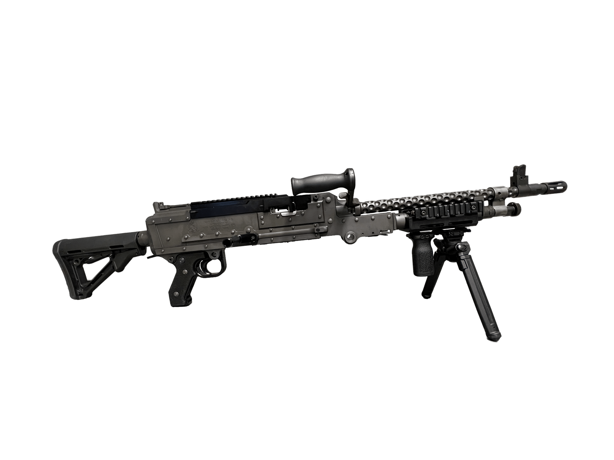 The OOW 240P-SLR is a belt-fed, air cooled Rifle, capable of sustained and accurate fire while using a shorter and lighter barrel, M4 style collapsible stock, removable lightweight bipod and a foregrip due to the new bottom picatinny rail.